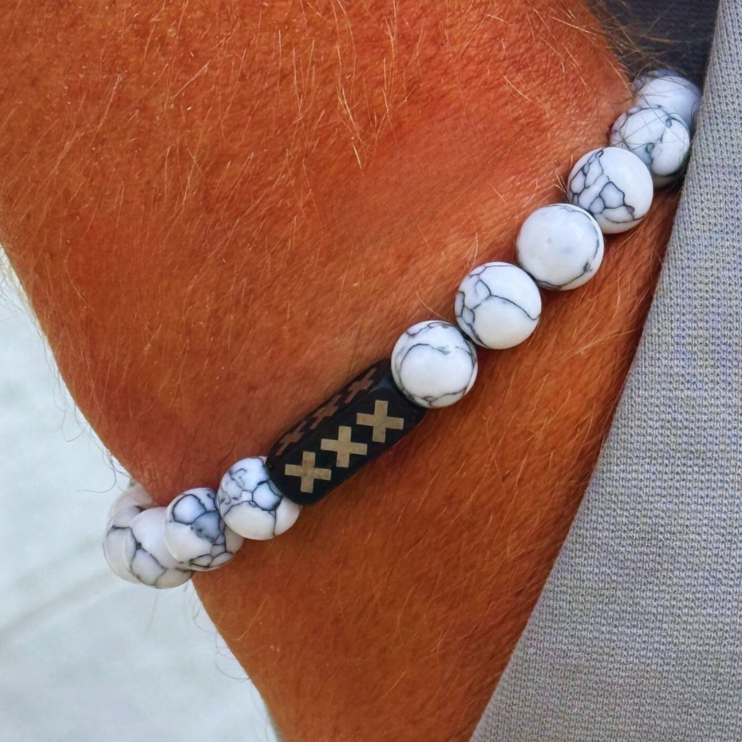 Gemaakt van hoogwaardige natuurstenen kralen (8mm) en afgewerkt met een stijlvol detail van de drie kruizen. De armband is elastisch en past comfortabel om polsen van 18 tot 22 cm.