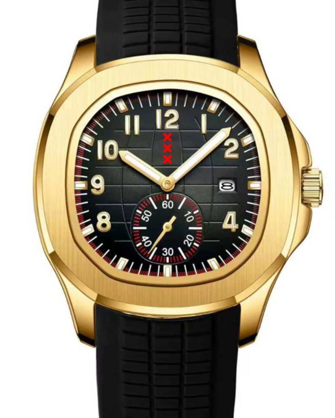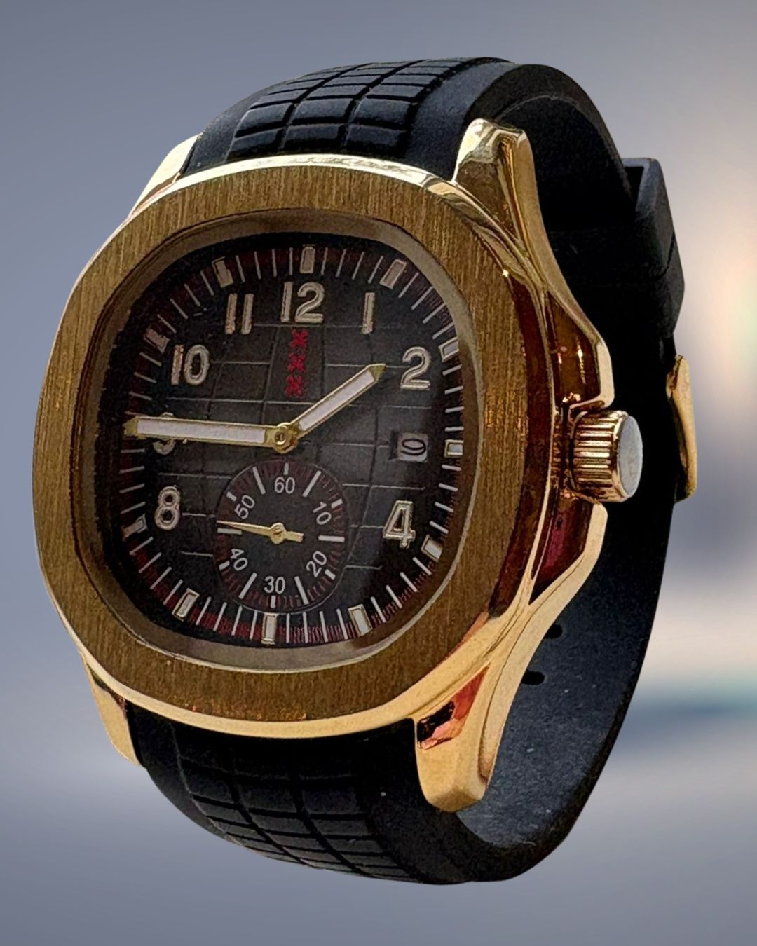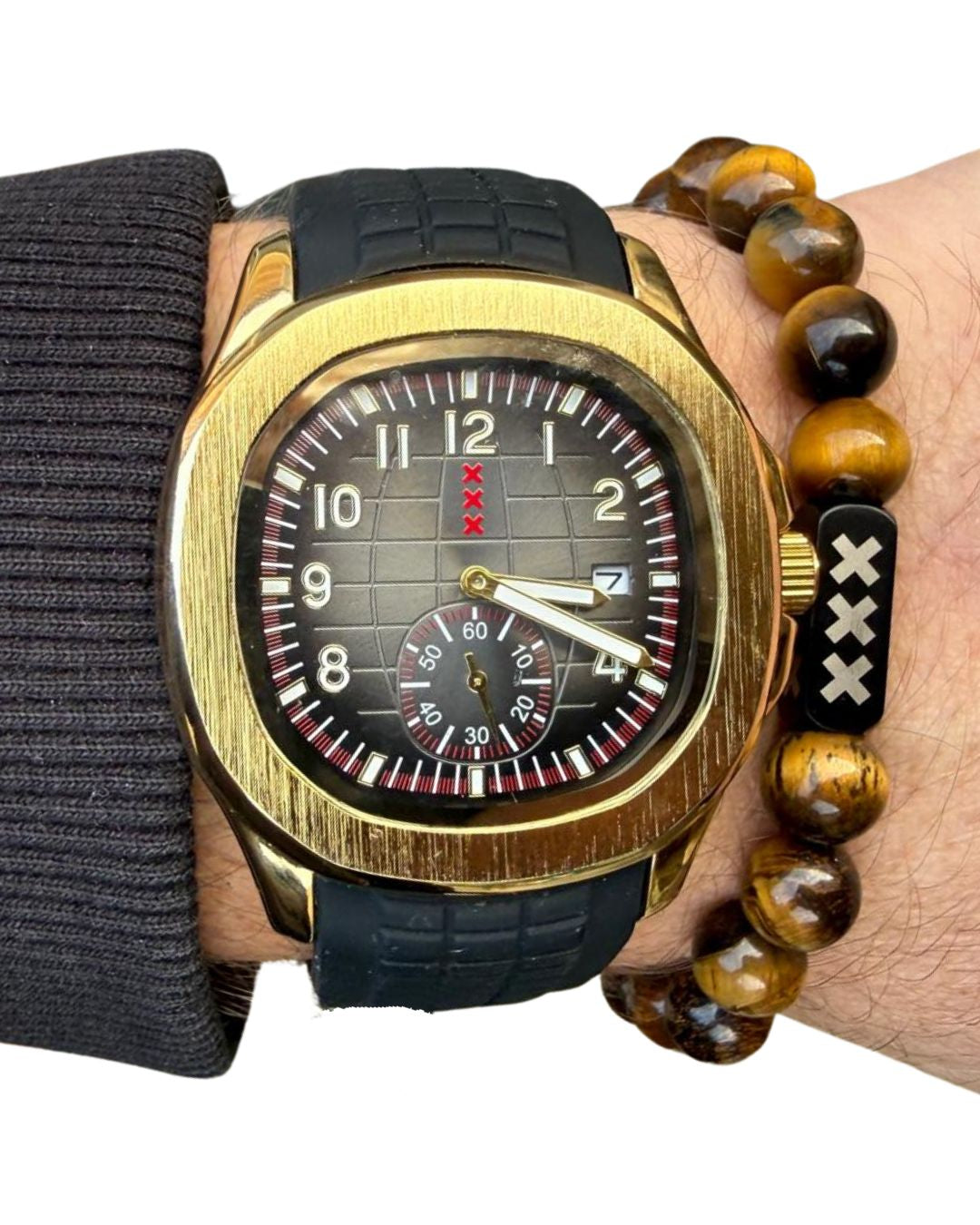 🛡️ Sterk roestvrij staal: De kast, 44 mm, loopt soepel over in de rubberen band, waardoor het horloge één geheel vormt en stevig maar toch comfortabel aanvoelt.