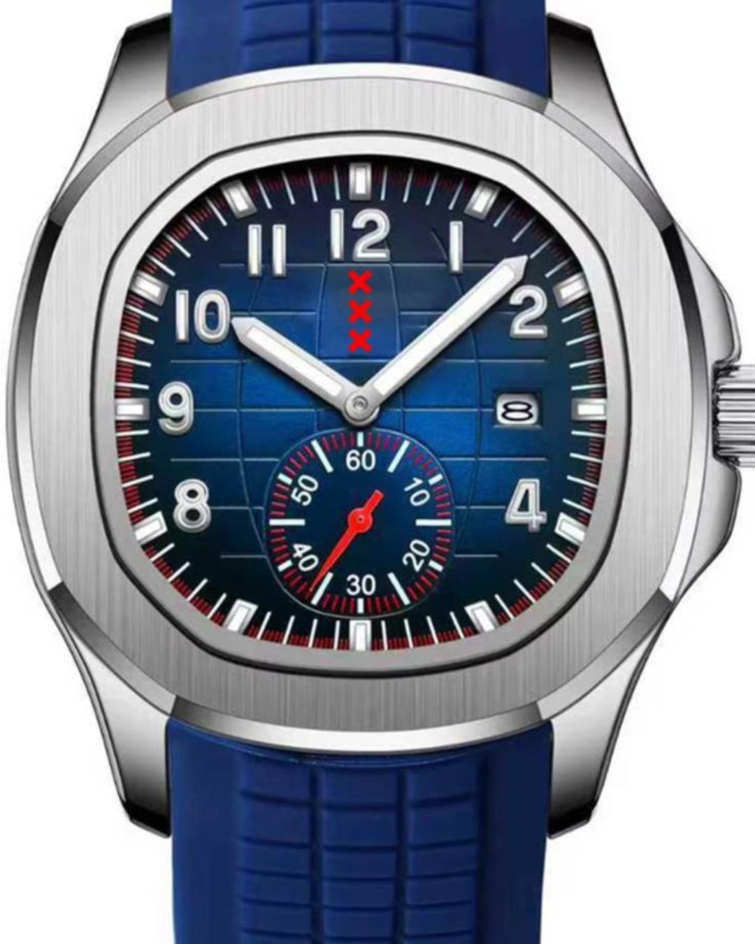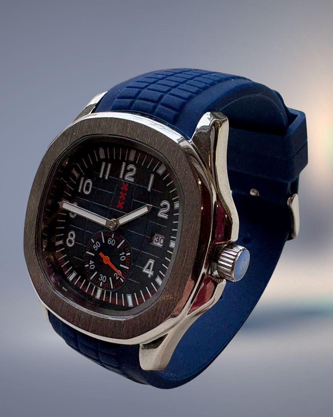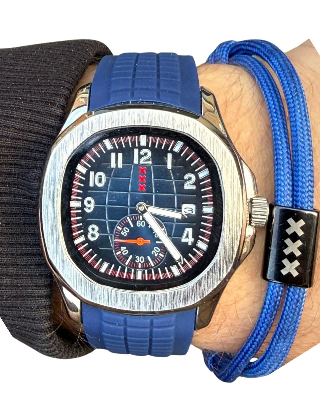 🛡️ Sterk roestvrij staal: De kast, 44 mm, loopt soepel over in de rubberen band, waardoor het horloge één geheel vormt en stevig maar toch comfortabel aanvoelt.