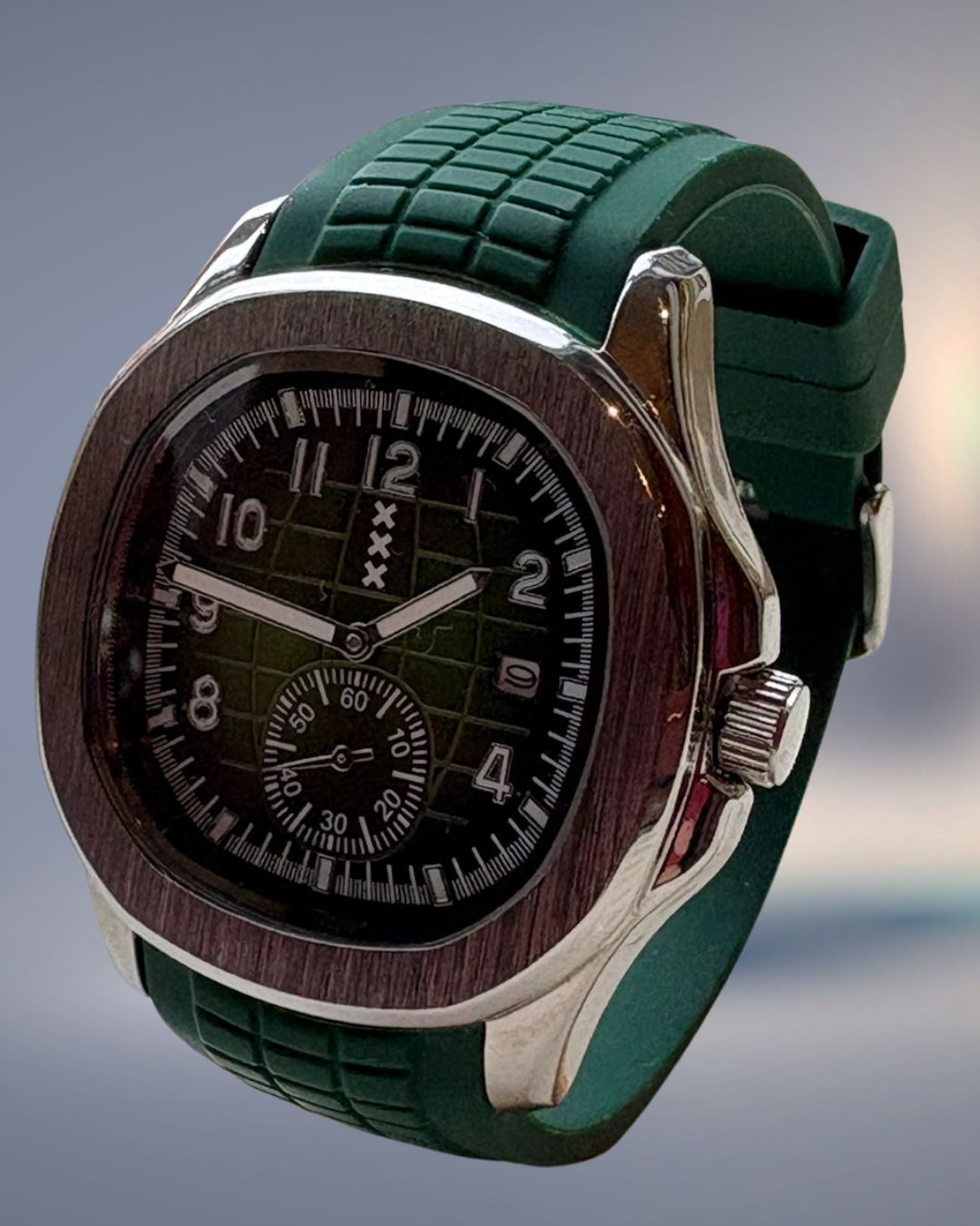 🛡️ Sterk roestvrij staal: De kast, 44 mm, loopt soepel over in de rubberen band, waardoor het horloge één geheel vormt en stevig maar toch comfortabel aanvoelt.