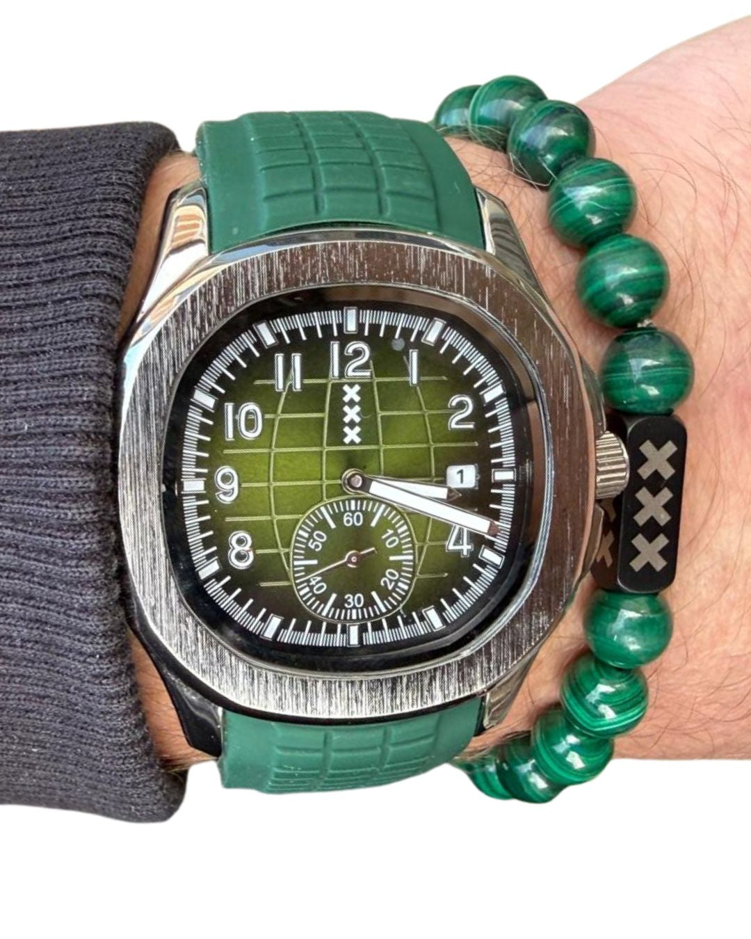 Dit prachtige Quartz klokje met groene rubberen band is van verguld stainless steel en heeft een groene wijzerplaat en is natuurlijk uitgevoerd met de onmiskenbare Amsterdamse Kruizen in het wit.