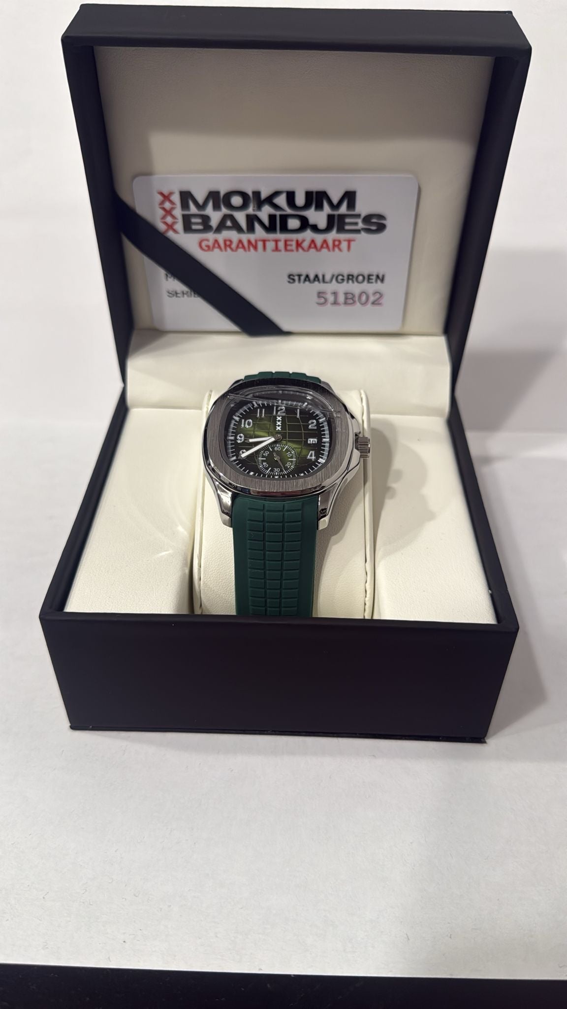 🛡️ Sterk roestvrij staal: De kast loopt soepel over in de rubberen band, waardoor het horloge één geheel vormt en stevig maar toch comfortabel aanvoelt.